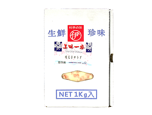 明太子沙律 1kg/盒 ----------------------------------------------------------------------- 明太子是以日本的助宗鱈魚生魚卵,經過加工處理後是成現紅色的. (大多是加鹽、紅辣椒粉和一些調味料浸漬)